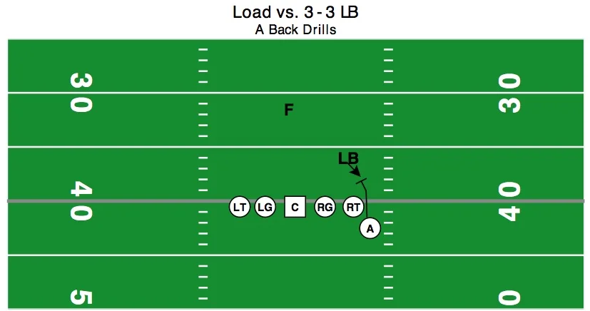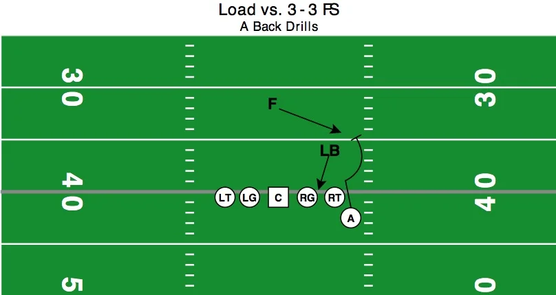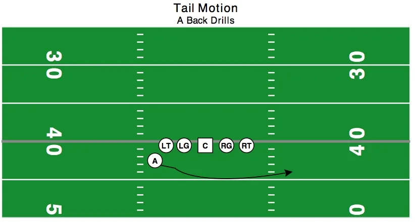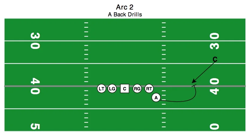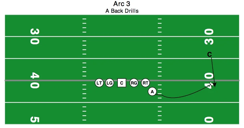 Continue parallel to line of until the PST, then start to bend towards LOS in pitch phase. It is important that you have your A-backs look in towards QB for pitch. You can add a football to this drill to simulate the ball being pitched or have the next A-back in line hold up a number with their fingers to get the motion back.