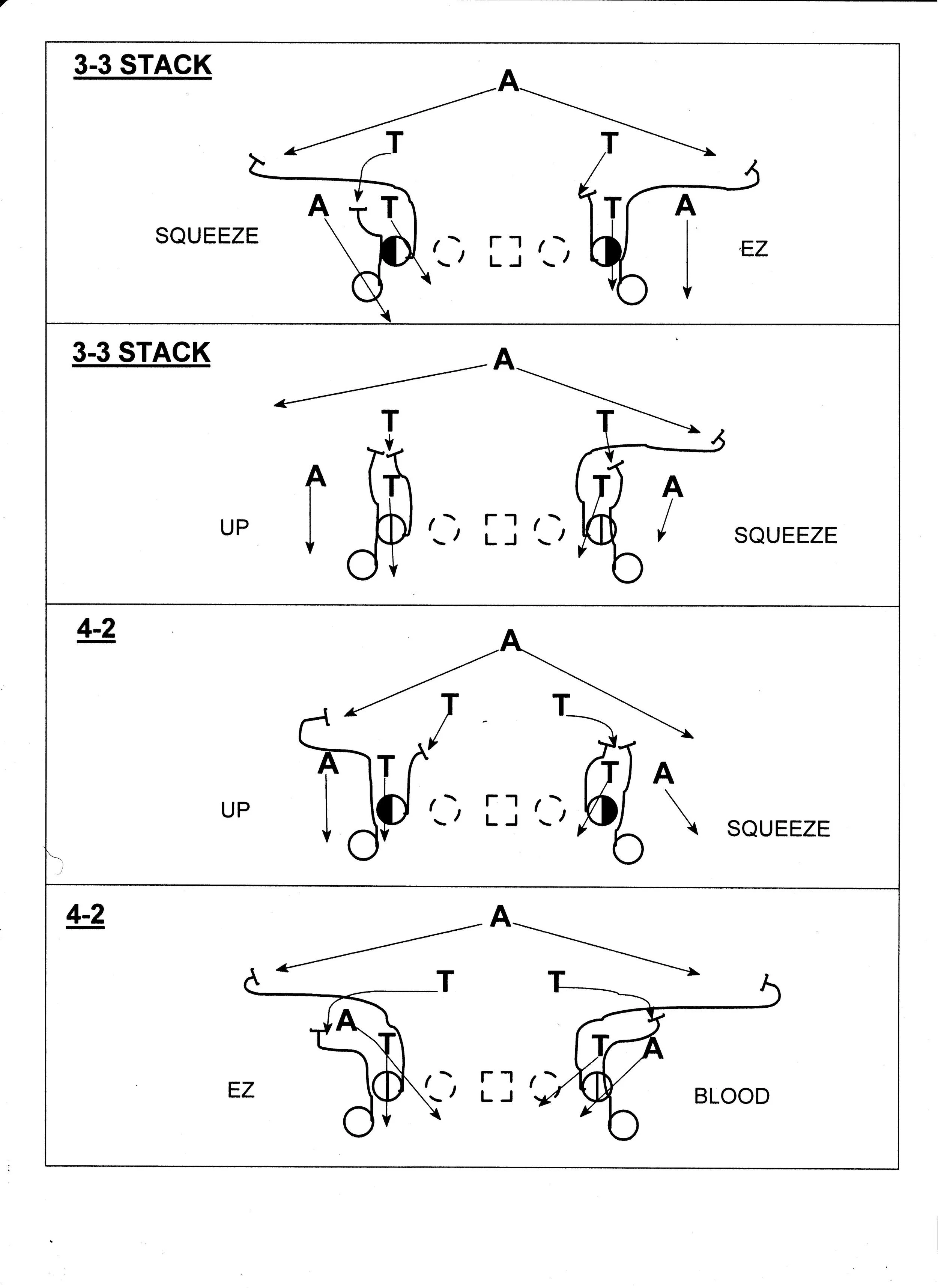 - 3-3 Cov 3 - Load the Stack LB to FS (Stunts: EZ with DE and Stack LB, Blood with DE/OLB, Squeeze)