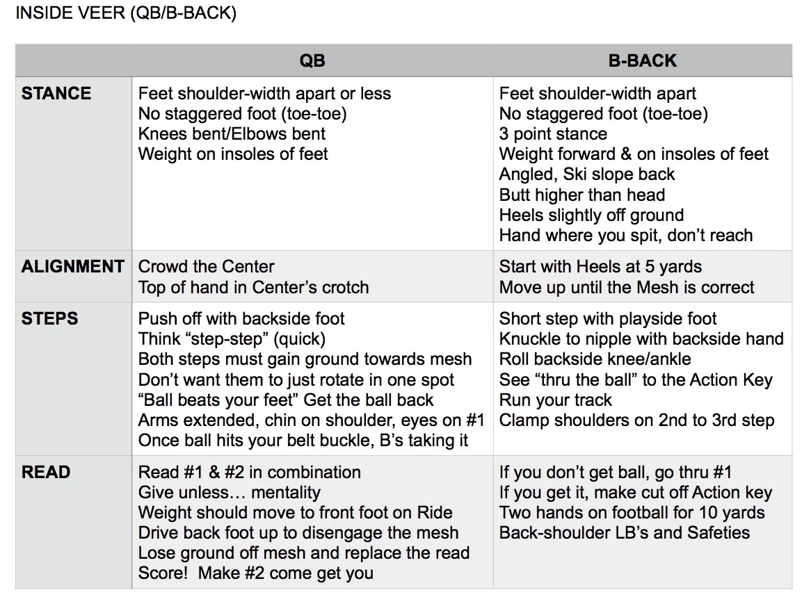 Today, I'm going to talk about QB/B-back play for Inside Veer. The quality of play from these two positions is the single most important factor in making this a productive play. You've got to have your most trusted, best decision maker at QB and your best running back at B-back. We're going to spend a lot of time talking about the mesh, which is the dive/keep phase of our Inside Veer play. We'll also talk about stance, alignment, footwork, steps and reads.