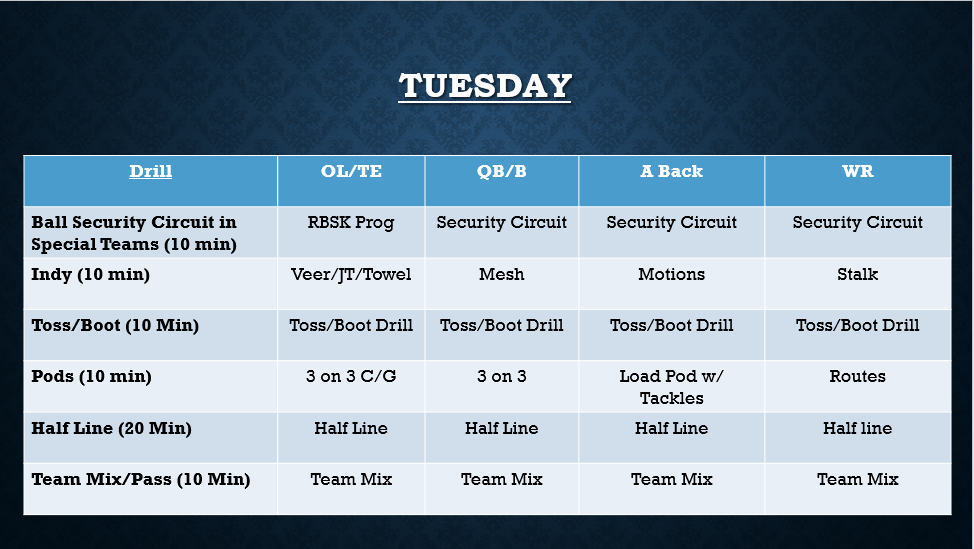 When trying to figure out a starting point for installing and becoming proficient at running option football, practice time and organization are a huge part of success. Whether your practices are split O/D or if you focus on one side of ball each day, there are some consistencies that need to be incorporated into your practice schedule. At my current school, our practices are split. We take 30 min for special teams each day and then our offense gets an hour and our defense gets an hour. Sometimes these things change and we extend a little or cut back a little but we try and keep things as consistent as we can. Let’s look to a sample Tuesday in-season practice and break down its components.