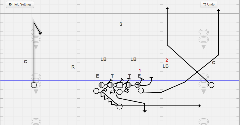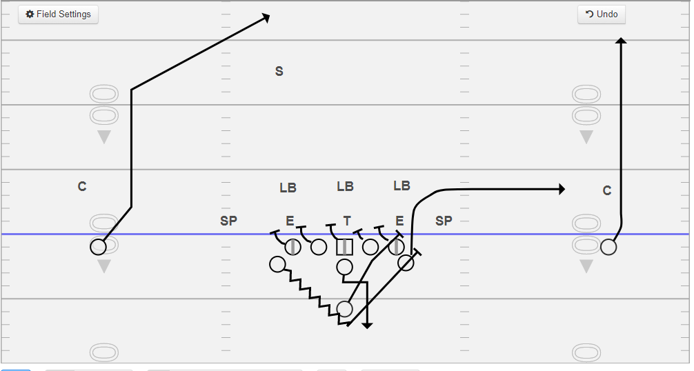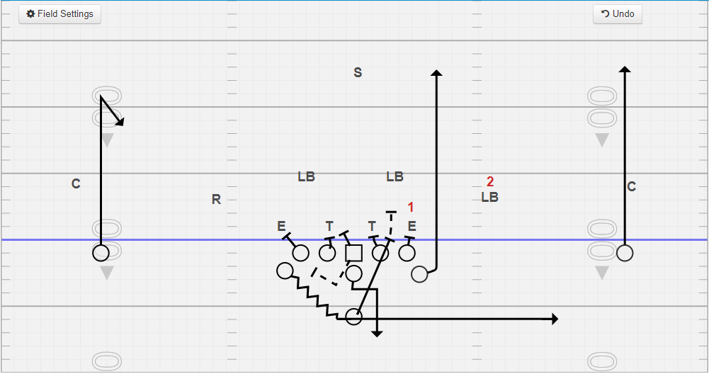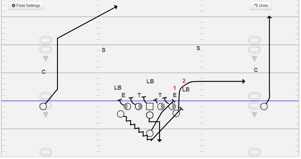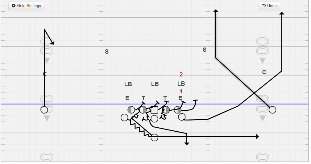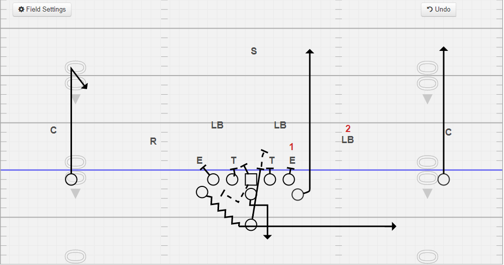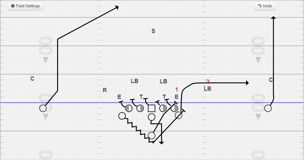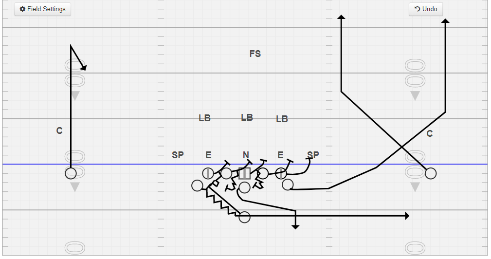 Using the image above we will discuss play action off inside veer using a man scheme vs. a 4-4 defense with the 3 technique to the playside. We used this scheme to force the playside defenders to honor their option assignments, hopefully opening up windows and grass to attack with front side routes or with a backside route.