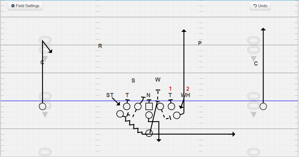 QB - Critical to open up like toss and sell the toss fake. This can really help the offensive lineman blocks as I have seen down lineman react to the QB and run flat to the BSA thus allowing an easier pocket to be established. The QB’s momentum on the fake takes him off the midline and on a 45 degree angle of departure. He must get depth after the fake and we use a 5 step rule when installing his drop mechanics. When running the fake to the left, a right handed QB will complete his fake just like he did to the right, but make a left handed drop and then flip his hips to convert to a right handed set at the top of his drop to make the throw.