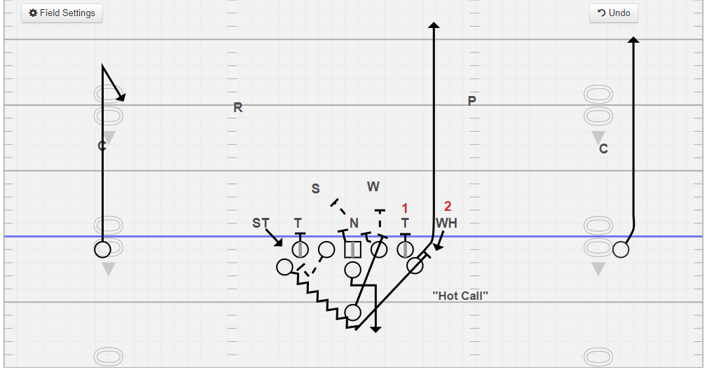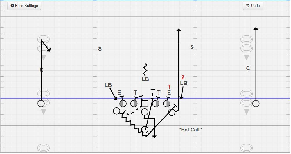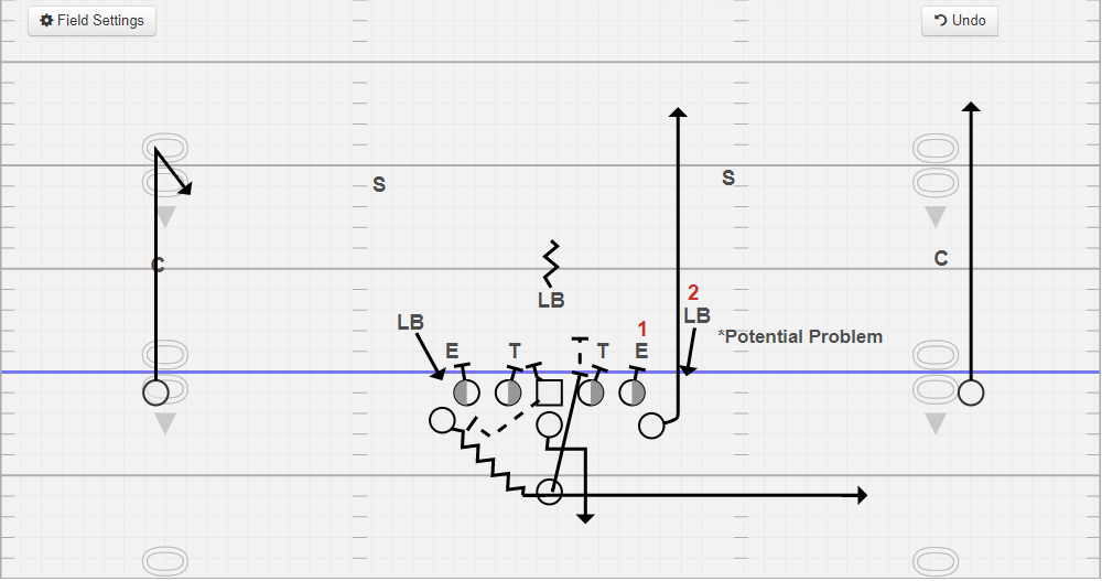 * There is potential problem in the protection in the above diagram as the playside hipped backer is in a threatening position and could blitz, potentially unblocked. When we ran this protection we allowed the QB to recognize this pre-snap and make a “hot call”. This alerted the BSA to leave early in the cadence and become a part of protection playside to block the EMOLS. This “hot call” also affects the playside guard if uncovered, he will need to work down to the nose to help the center and then spy the backside linebacker. Below are examples of both scenarios.