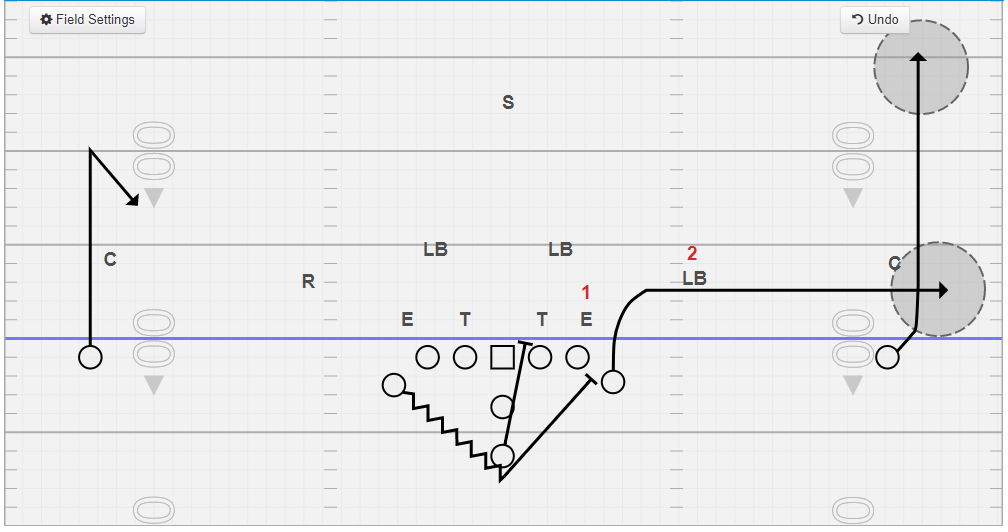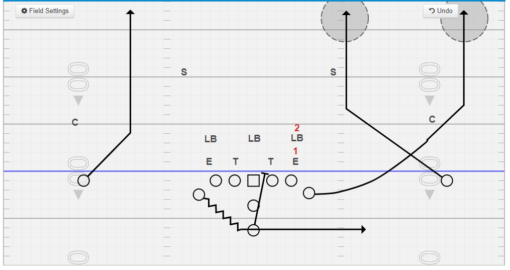 In this blog post we will discuss playaction route combinations in the flexbone offense and when and why to use them. I want to start of by saying these route concepts are what we call them. You may have the same concepts but have different names for them. The first concept we will discuss is a Pop pass off playaction.