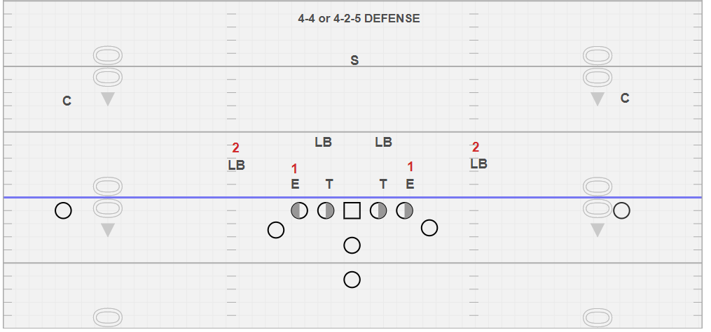 In this blog we will discuss the many even front defenses you may face as a new option coach. As we work through the different looks you may see, I want to remind you that these are labels that we use to identify different defenses. You may call them something different and that is ok. When we begin the discussion with our players about defenses we try to group the different looks into Even Fronts, Odd Fronts, and Junk. We also label who #1 and who #2 are in each scenario for the purposes of our base Inside Veer play. For the purpose of this article #1 is the hand off key (dive key) and #2 is the pitch key. We will begin with discussing a 4/4 or 4-2-5 defense.