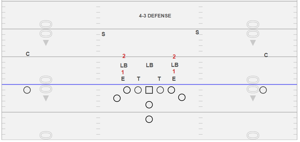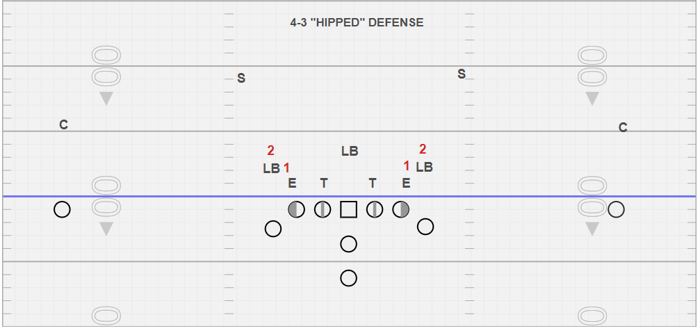 We call the image above a 4-3 “hipped” defense. We refer to the “hipped” portion of the name to the linebackers that align on the defensive ends outside hip and a yard away. For us, we clearly define the defensive end as #1 and the “hipped” linebacker #2. We feel they have declared and unstacked pre-snap. This is not to say they can’t still play games with your reads. We feel the QB can see better, if #2 wraps inside of #1 out of this alignment. We also feel with #1 and #2 outside the PST we can take advantage of B gap with a couple of different option plays.