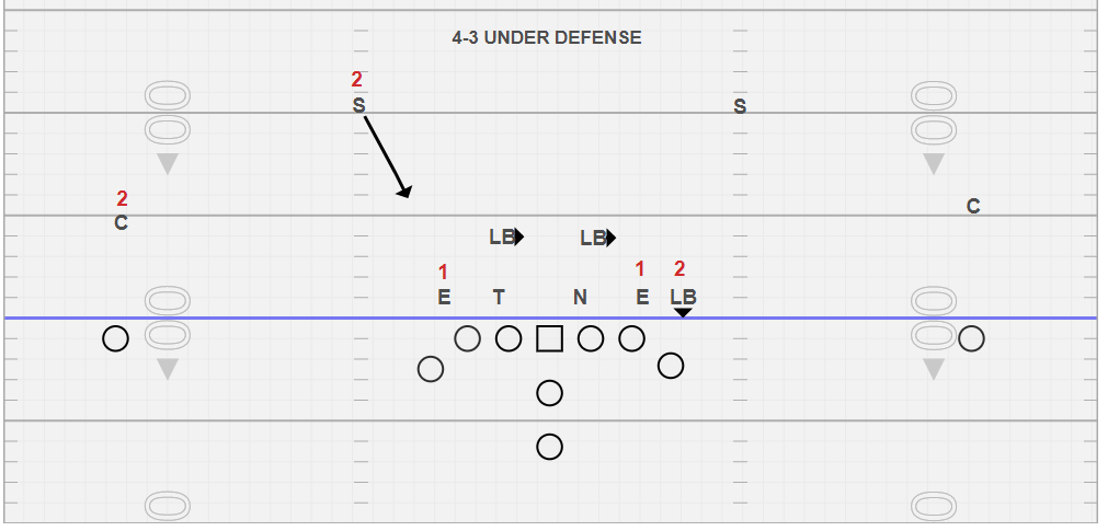 The next defense we have drawn is what we call Under. We teach the players that the linebackers have pulled the string and have shifted to our right and the defensive line has pulled the string and have shifted to our left. This is still an even 4-3 defense to us, even though you could consider #2 on the LOS thus making an odd front. We clearly define the defensive end #1 and the LB on the LOS to our right as #2. The other side of the defense is where being able to define #2 can get tricky. If we can determine the corner is below the hard deck (reference our previous article for what the hard deck is) then we would consider him #2, if the corner isn’t below the hard deck then we would assume the safety is rolling down behind the linebackers to be a force/cutback player and we would consider him #2.