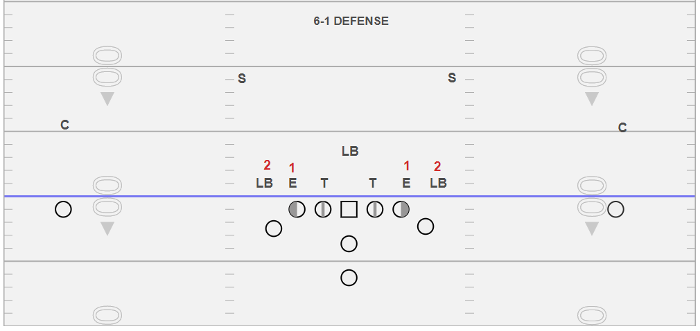 This is the last even front defense we teach our players. This is what we call a 6-1 defense. We define both outside linebackers on the line of a scrimmage and in the box. The defensive end we define as #1 and the LB on LOS as #2. Most often we get the defensive lineman head up to inside the guards and tackles even though I don’t have it drawn that way exactly. We get a lot of “blood” stunts out of this look, which means that #1 spikes inside fast for the dive and #2 spikes inside fast for QB on the snap of the ball, looks like a blitz by both of them. We teach our QBs and A backs that if #2 is in a threatening position expect a pitch quickly and you will need to alter you pitch path so that you can be in the QB’s vision quickly. This is why, if you have read some previous posts, we have the A backs make loud “ball.ball..ball…” calls as they are looking at the QB while motioning. This gives confidence to the QB that he can hear you and see you and get the pitch delivered quickly and with confidence.