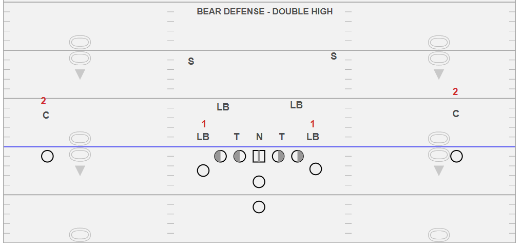 We see this next defense a lot during the season. Again, the Center and Guards are covered so we identify this as Bear defense. You also may hear some coaches call it double eagle. In this image the defense has added a linebacker/safety to the box, making it a 5-3 look. Because we count #1 as on or outside the PST we label the defensive end as #1 and the playside linebacker as #2. One thing to keep in mind, we typically add an over tackle or tight end to create three man surfaces to keep this defense off balance.