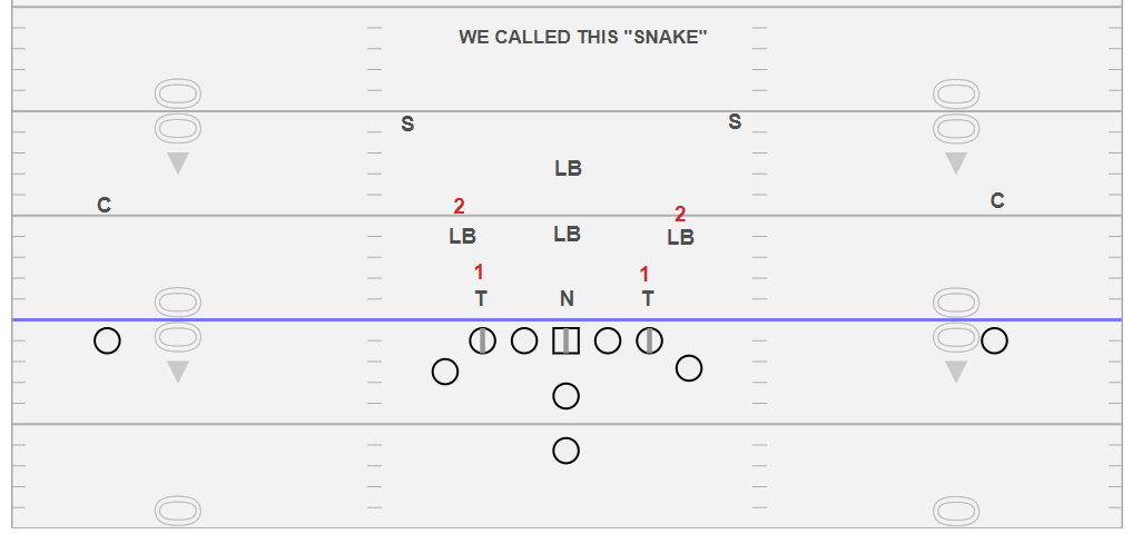 This last defense we called Snake. This one sneaked up on us in a game and really bit us! We weren’t prepared and we didn’t identify things correctly. If you follow your rules, #1 is easy to label, the 4 technique is on the PST. #2 is the harder issue, we decided to label the stacked linebackers as #2 and we decided to block the Mike and the “Snake Backer” with the offensive line. This one can be tough to adjust to if you haven’t seen it before.