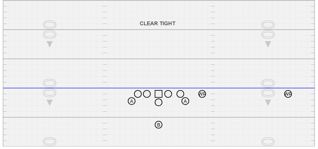 We use this vs. 8 man fronts, in particular Bear fronts beacuse it gices you a three man surface without needing a TE/Extra Tackle. If we wanted the formation flipped, we would just signal Clear Tight Flip.