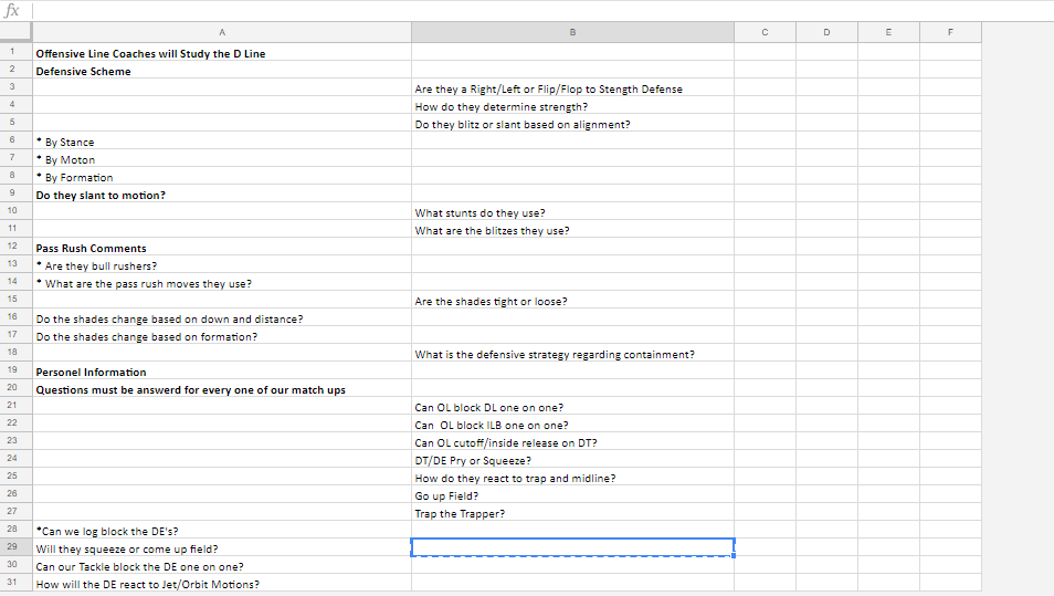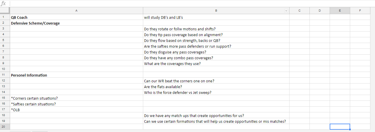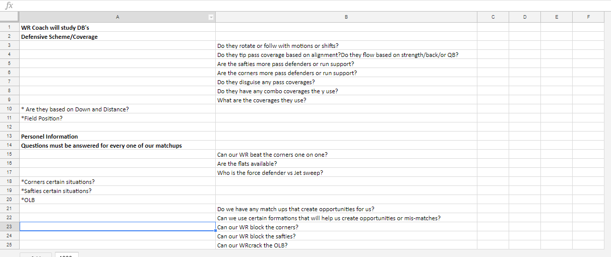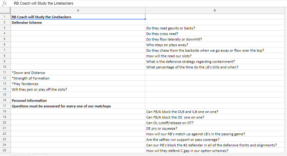 First off, we keep this spreadsheet in a google sheets document in our team google drive account. The great thing about google sheets is it allows you to work on filling in your questions while another coach can be in the same document working on his film study and it saves it all as you work. This allows us to have a working document in one space for all the coaches to see and use.